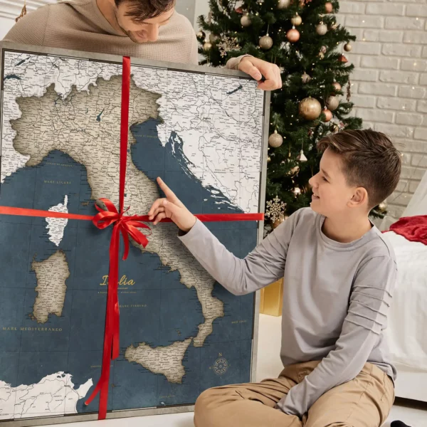 Unsere handgefertigte Italienkarte besteht aus hochwertigem Baumwolltuch, einem Holzrahmen und einem Pinnwandträger.