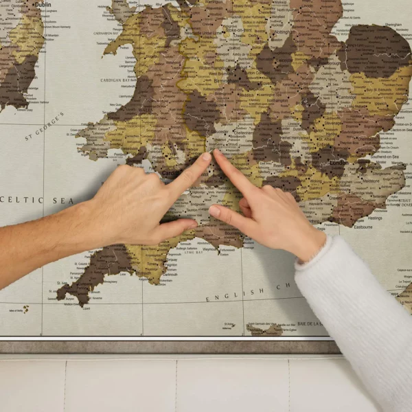 Unsere handgefertigte Karte von Großbritannien besteht aus hochwertigem Baumwolltuch, einem Holzrahmen und einem Pinnwandträger.