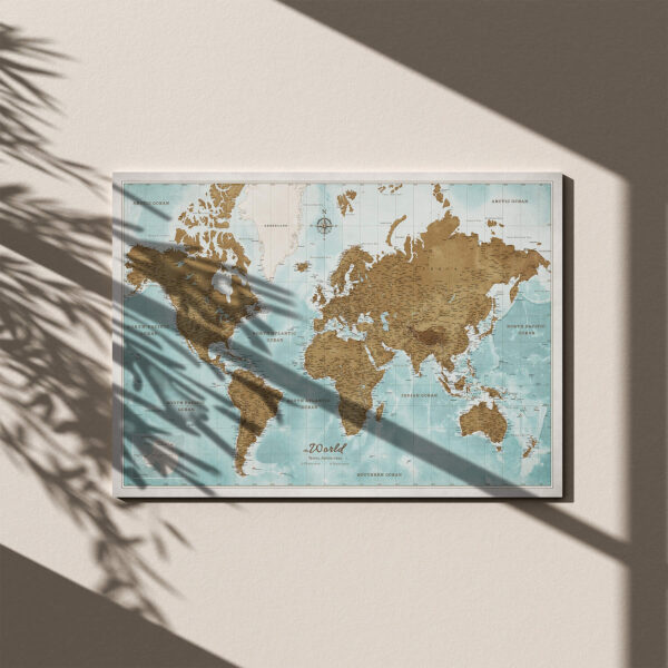 Die Karte ist fertig zum Aufhängen und benötigt keinen zusätzlichen Rahmen. Die Leinwand wird mit der Rückseite fest auf den Rahmen gespannt, so dass die Stecknadeln perfekt auf der Karte haften und Sie die von Ihnen gewählten Orte markieren können.