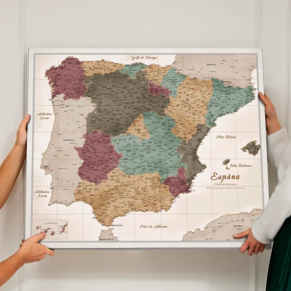 Unsere handgefertigte Karte von Spanien besteht aus hochwertigem Baumwollgewebe, einem Holzrahmen und einer Pinnwand.