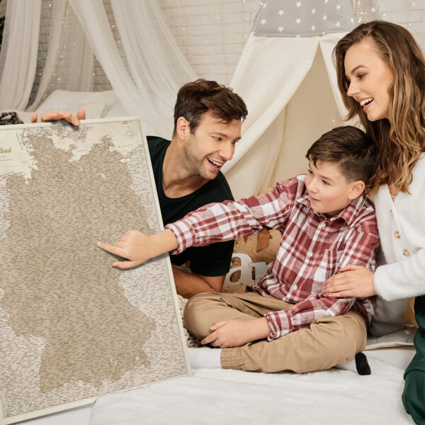 Die Karte ist fertig zum Aufhängen und benötigt keinen zusätzlichen Rahmen. Die Leinwand ist fest über den Rahmen mit der Rückseite gespannt, sodass die Stecknadeln perfekt in der Karte stecken und Sie bestimmte Orte markieren können.