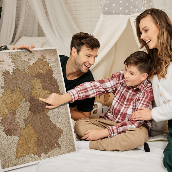 Die Karte ist fertig zum Aufhängen und benötigt keinen zusätzlichen Rahmen. Die Leinwand ist fest über den Rahmen mit der Rückseite gespannt, sodass die Stecknadeln perfekt in der Karte stecken und Sie bestimmte Orte markieren können.