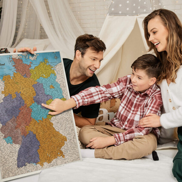 Wenn Sie ein schönes Geschenk für Reiseliebhaber suchen, machen Sie mit unserer Deutschlandkarte Pinnwand nichts falsch! Eine Landkarte als Pinnwand ermöglicht dem Beschenkten, seine Reisen zu dokumentieren. Mit bunten Stecknadeln lassen sich sowohl Reisefotos als auch kurze Beschreibungen an die Karte anbringen. Auch wenn Sie nach einem Geschenk für Geographie-Enthusiasten, Lehrer oder Geographie-Studenten suchen, können Sie sich für eine hochwertige Deutschlandkarte zum Markieren von Reisezielen entscheiden. Gerne helfen wir Ihnen, die richtige Größe auszuwählen.