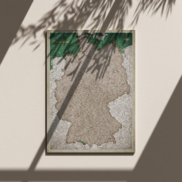 Die Karte ist fertig zum Aufhängen und benötigt keinen zusätzlichen Rahmen. Die Leinwand ist fest über den Rahmen mit der Rückseite gespannt, sodass die Stecknadeln perfekt in der Karte stecken und Sie bestimmte Orte markieren können.