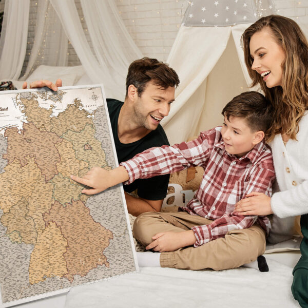 Die Karte ist fertig zum Aufhängen und benötigt keinen zusätzlichen Rahmen. Die Leinwand ist fest über den Rahmen mit der Rückseite gespannt, sodass die Stecknadeln perfekt in der Karte stecken und Sie bestimmte Orte markieren können.
