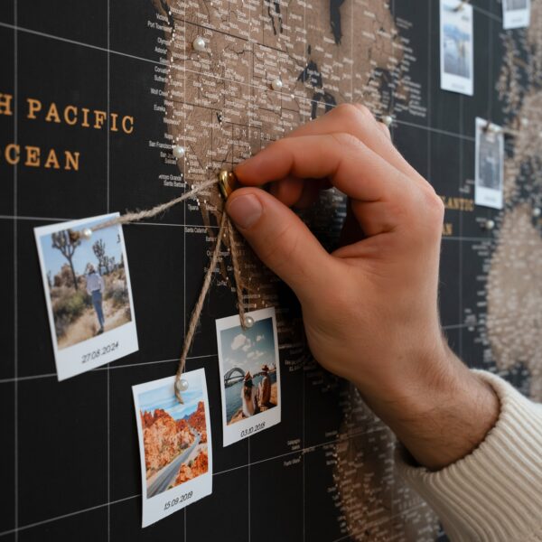 Die Karte ist fertig zum Aufhängen und benötigt keinen zusätzlichen Rahmen. Die Leinwand ist fest über den Rahmen mit der Rückseite gespannt, sodass die Stecknadeln perfekt in der Karte stecken und Sie bestimmte Orte markieren können.