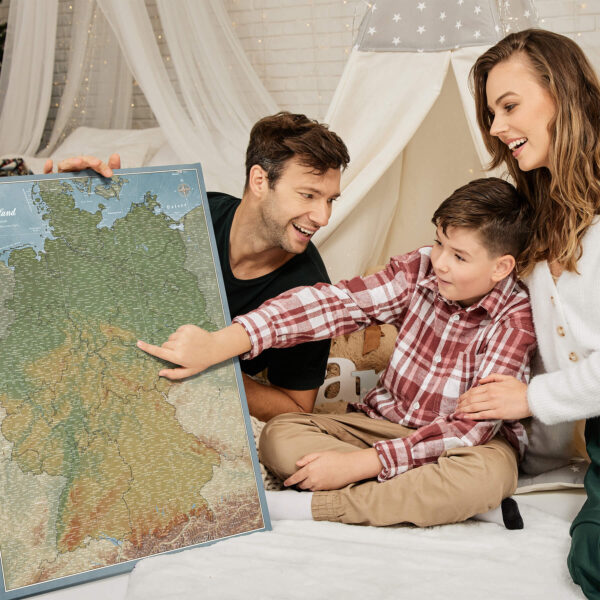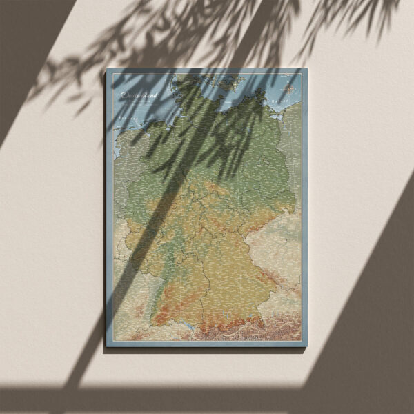 Die Karte ist fertig zum Aufhängen und benötigt keinen zusätzlichen Rahmen. Die Leinwand ist fest über den Rahmen mit der Rückseite gespannt, sodass die Stecknadeln perfekt in der Karte stecken und Sie bestimmte Orte markieren können.