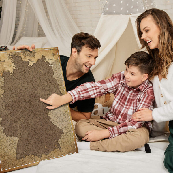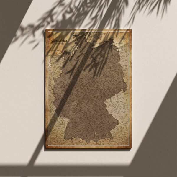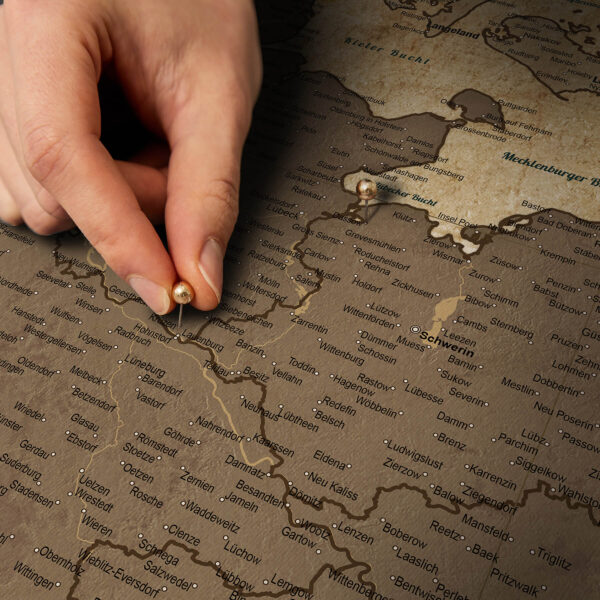 Die Karte ist fertig zum Aufhängen und benötigt keinen zusätzlichen Rahmen. Die Leinwand ist fest über den Rahmen mit der Rückseite gespannt, sodass die Stecknadeln perfekt in der Karte stecken und Sie bestimmte Orte markieren können.