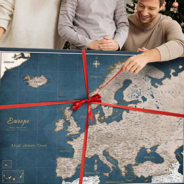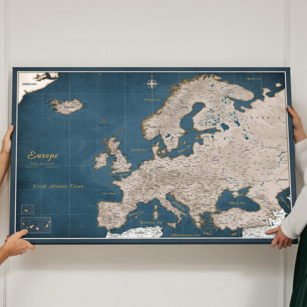 Die Karte ist fertig zum Aufhängen und benötigt keinen zusätzlichen Rahmen. Die Leinwand ist fest über den Rahmen mit der Rückseite gespannt, sodass die Stecknadeln perfekt in der Karte stecken und Sie bestimmte Orte markieren können.