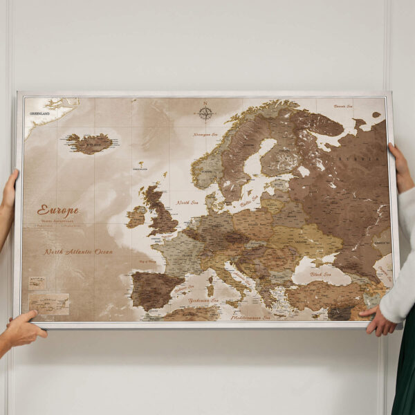Die Karte ist fertig zum Aufhängen und benötigt keinen zusätzlichen Rahmen. Die Leinwand ist fest über den Rahmen mit der Rückseite gespannt, sodass die Stecknadeln perfekt in der Karte stecken und Sie bestimmte Orte markieren können.