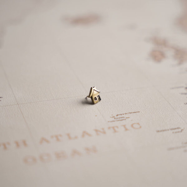 Die Karte ist fertig zum Aufhängen und benötigt keinen zusätzlichen Rahmen. Die Leinwand ist fest über den Rahmen mit der Rückseite gespannt, sodass die Stecknadeln perfekt in der Karte stecken und Sie bestimmte Orte markieren können.