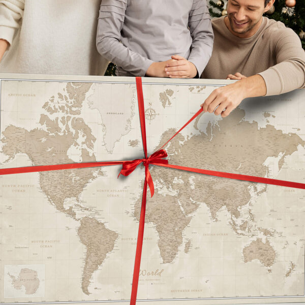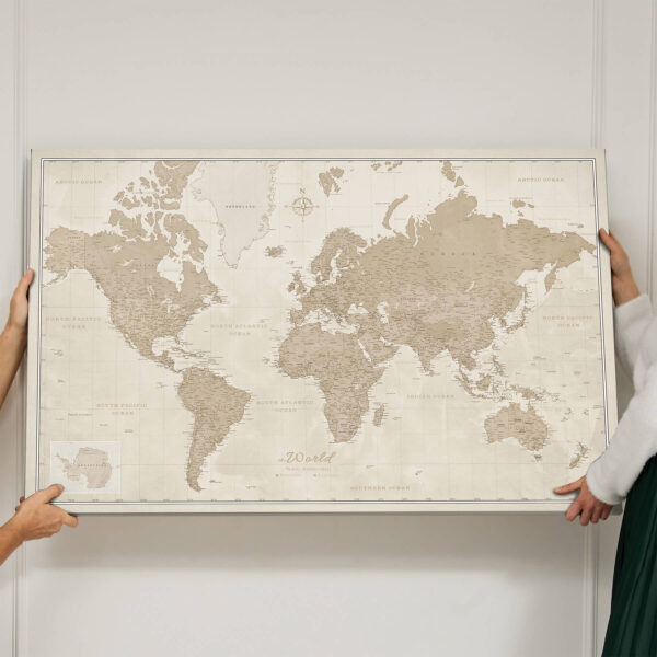 Unsere Karte ermöglicht, besuchte Orte zu markieren, damit Ihre Reiseerinnerungen nie verblassen. Eine sehr hohe Druckauflösung sorgt für eine detaillierte Darstellung von Ländern, Hauptstädten, Städten, Ozeanen und Meeren. Da sich unsere Karten durch eine solide Konstruktion auszeichnen, sind sie sehr langlebig.
