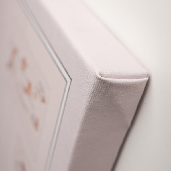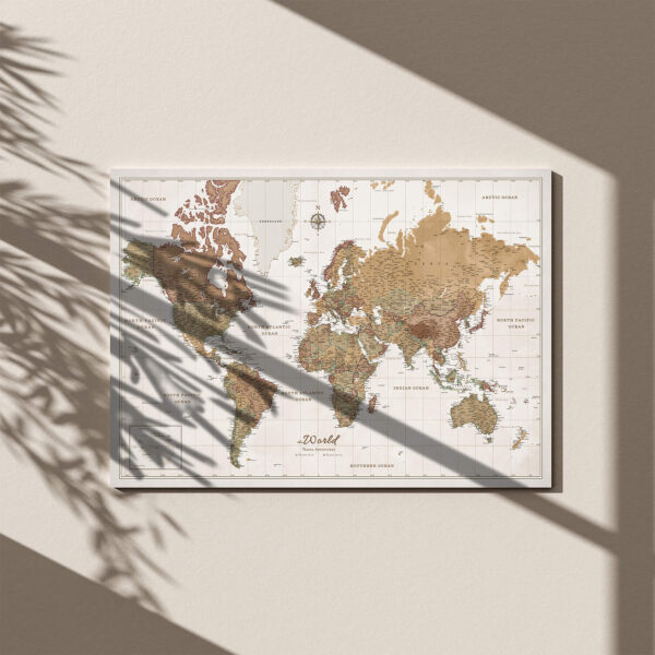 Die Karte ist fertig zum Aufhängen und benötigt keinen zusätzlichen Rahmen. Die Leinwand ist fest über den Rahmen mit der Rückseite gespannt, sodass die Stecknadeln perfekt in der Karte stecken und Sie bestimmte Orte markieren können.