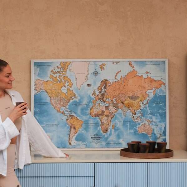 Unsere Karte ermöglicht, besuchte Orte zu markieren, damit Ihre Reiseerinnerungen nie verblassen. Eine sehr hohe Druckauflösung sorgt für eine detaillierte Darstellung von Ländern, Hauptstädten, Städten, Ozeanen und Meeren. Da sich unsere Karten durch eine solide Konstruktion auszeichnen, sind sie sehr langlebig.
