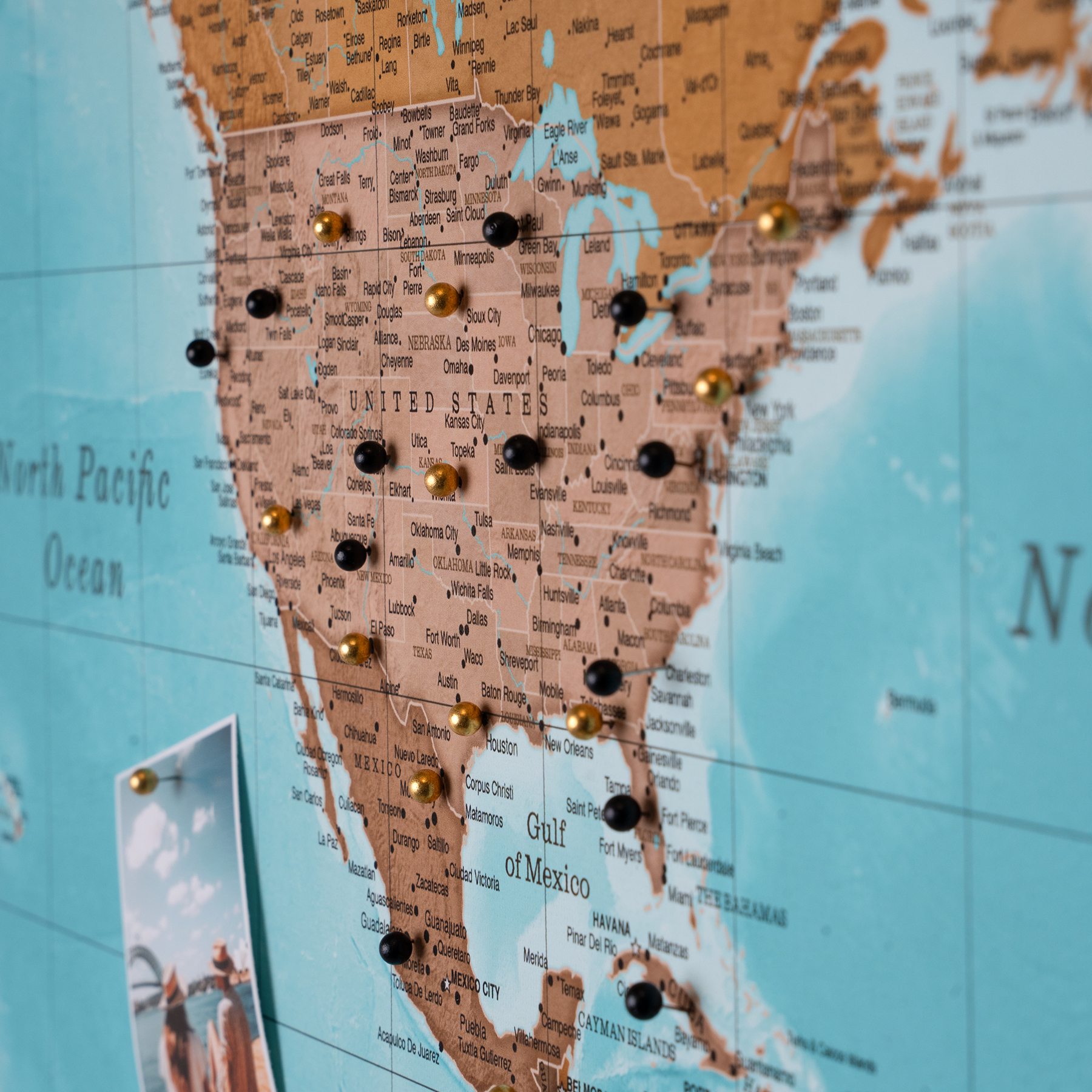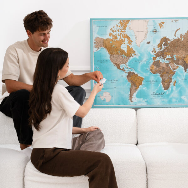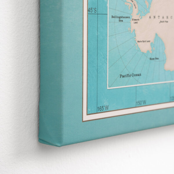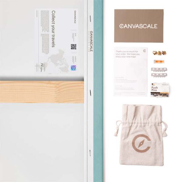 Die Karte ist fertig zum Aufhängen und benötigt keinen zusätzlichen Rahmen. Die Leinwand ist fest über den Rahmen mit der Rückseite gespannt, sodass die Stecknadeln perfekt in der Karte stecken und Sie bestimmte Orte markieren können.
