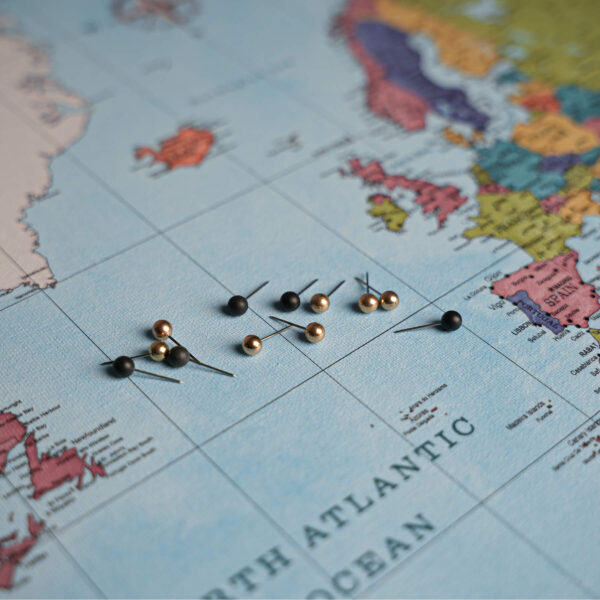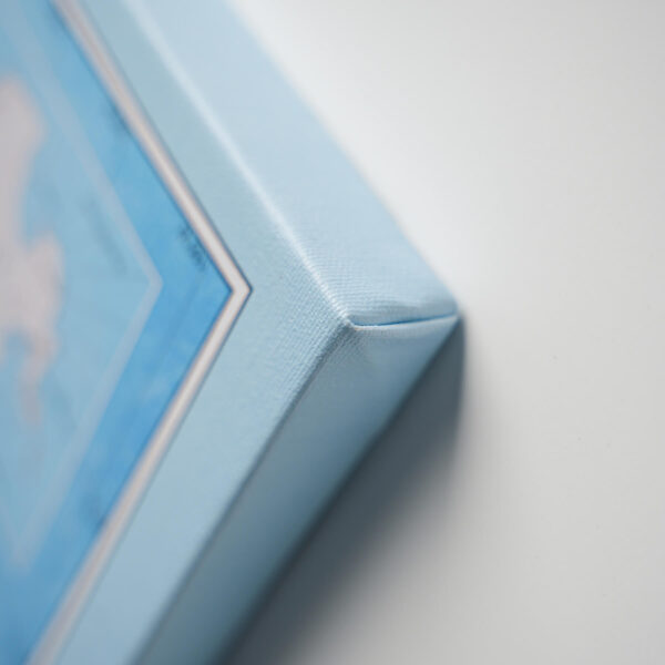 Die Karte ist fertig zum Aufhängen und benötigt keinen zusätzlichen Rahmen. Die Leinwand ist fest über den Rahmen mit der Rückseite gespannt, sodass die Stecknadeln perfekt in der Karte stecken und Sie bestimmte Orte markieren können.