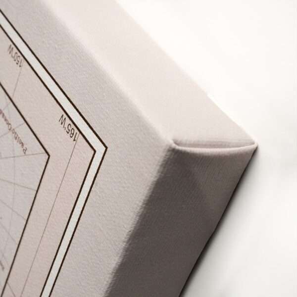 Die Karte ist fertig zum Aufhängen und benötigt keinen zusätzlichen Rahmen. Die Leinwand ist fest über den Rahmen mit der Rückseite gespannt, sodass die Stecknadeln perfekt in der Karte stecken und Sie bestimmte Orte markieren können.