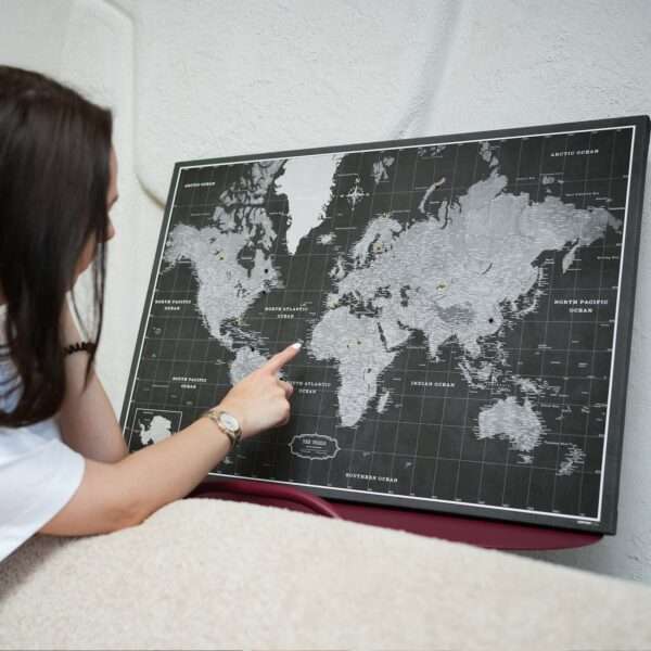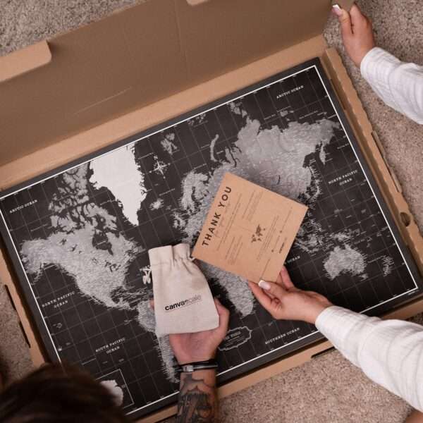Die Karte ist fertig zum Aufhängen und benötigt keinen zusätzlichen Rahmen. Die Leinwand ist fest über den Rahmen mit der Rückseite gespannt, sodass die Stecknadeln perfekt in der Karte stecken und Sie bestimmte Orte markieren können.