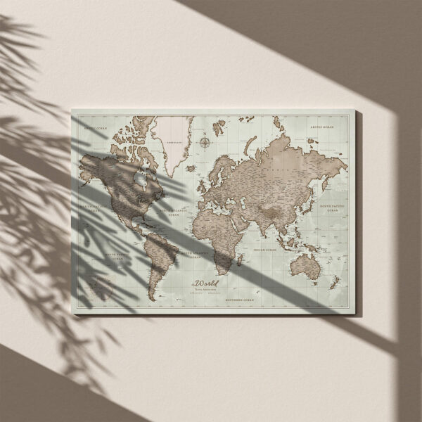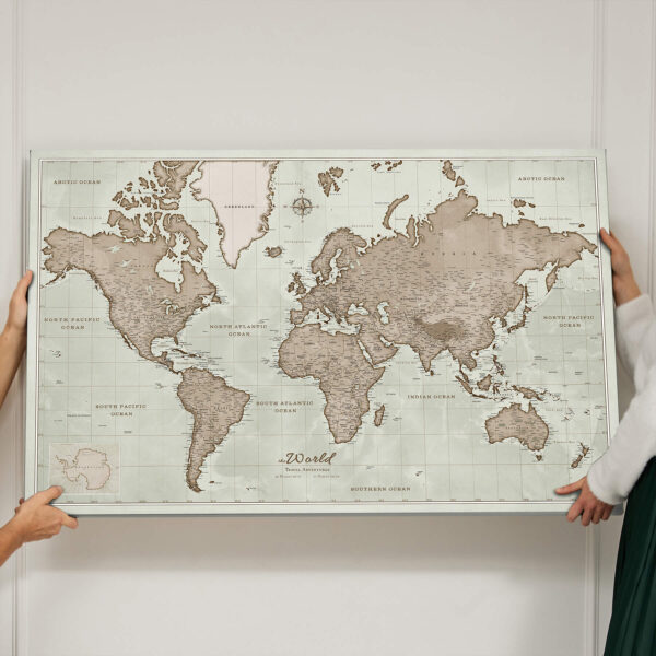 Die Karte ist fertig zum Aufhängen und benötigt keinen zusätzlichen Rahmen. Die Leinwand ist fest über den Rahmen mit der Rückseite gespannt, sodass die Stecknadeln perfekt in der Karte stecken und Sie bestimmte Orte markieren können.