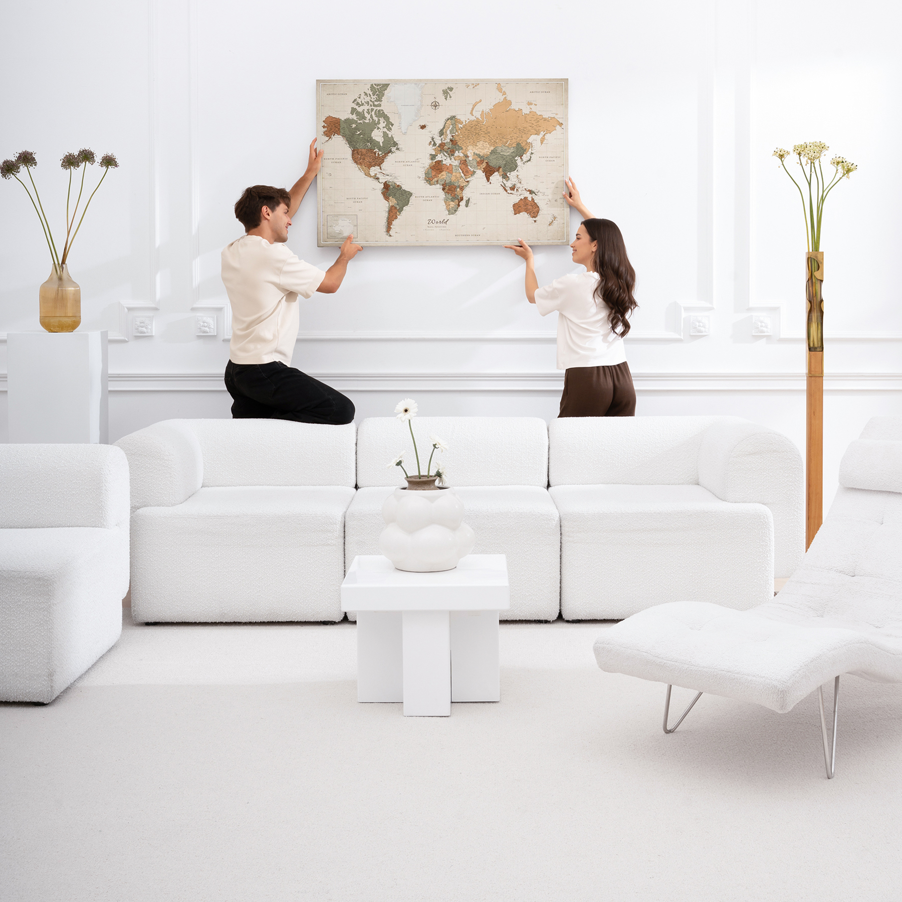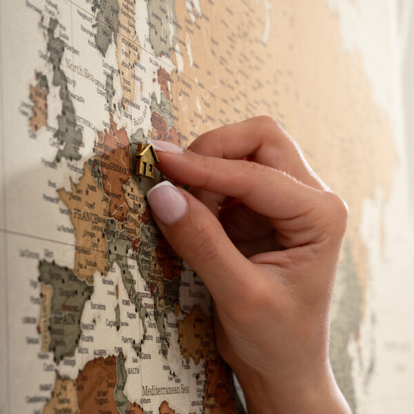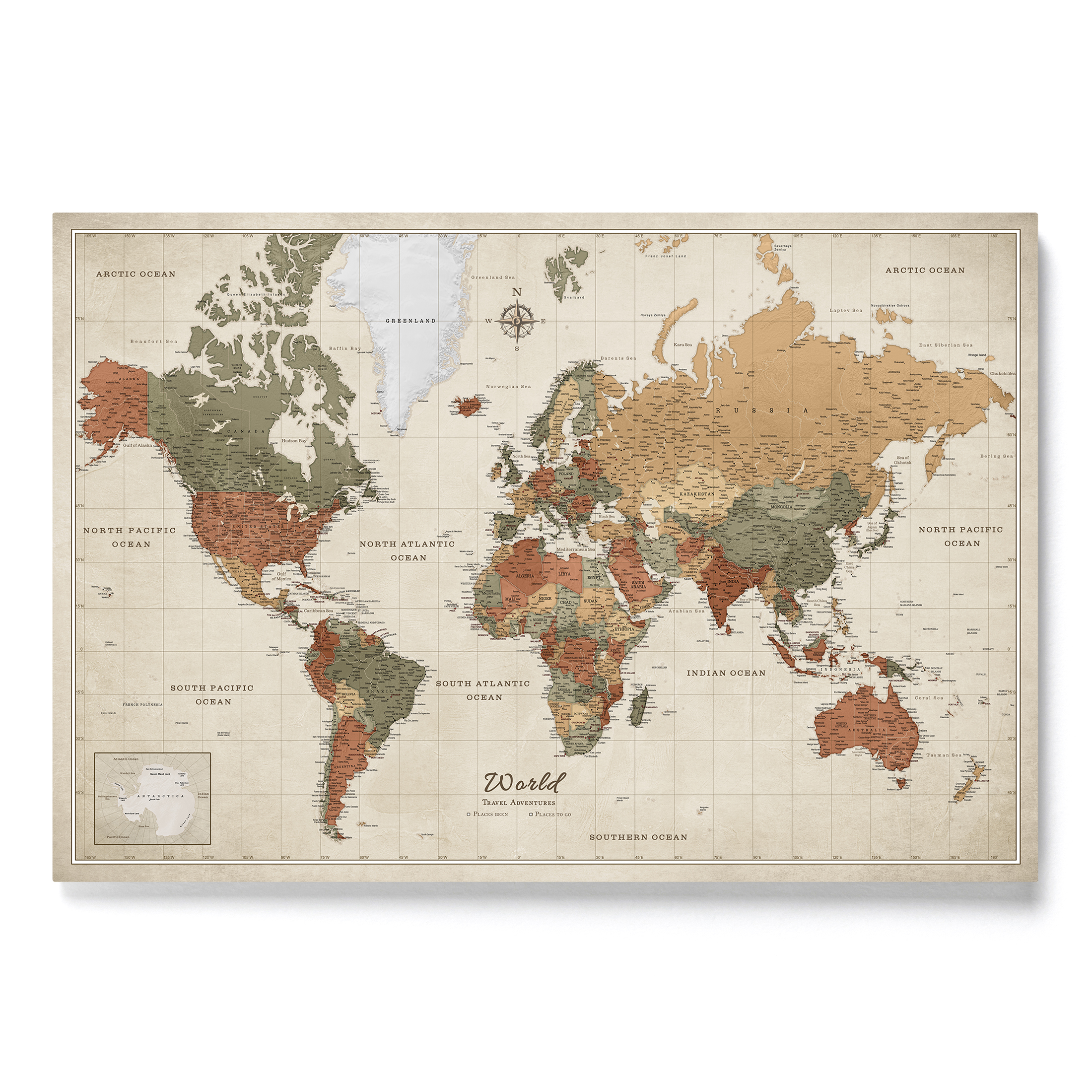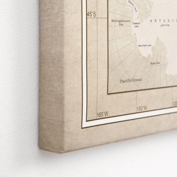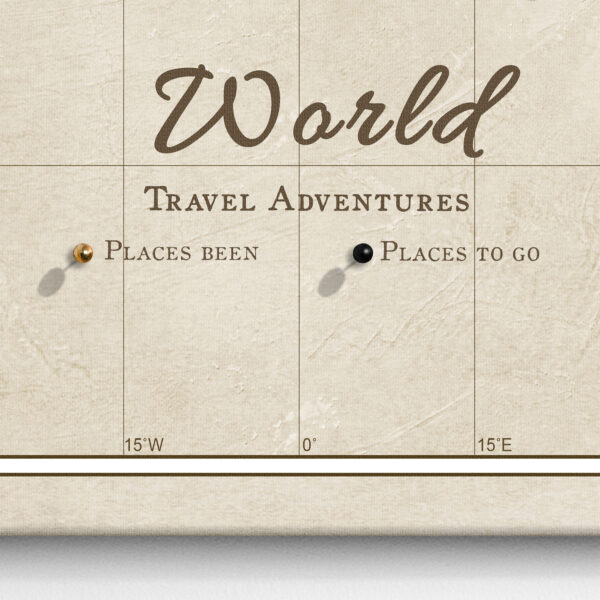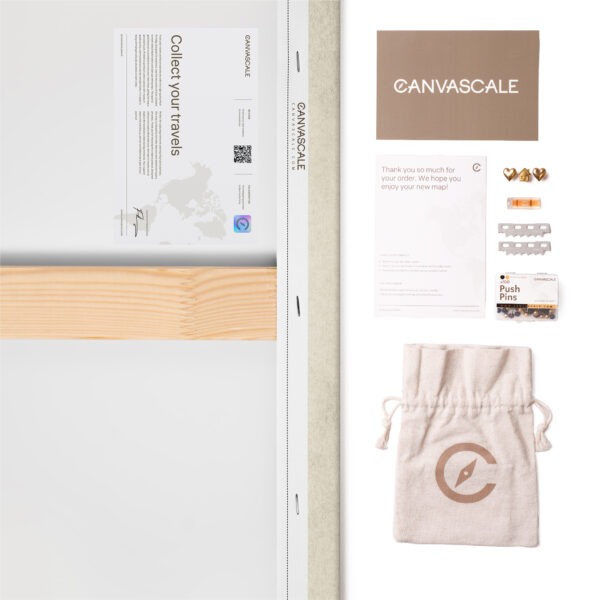 Die Karte ist fertig zum Aufhängen und benötigt keinen zusätzlichen Rahmen. Die Leinwand ist fest über den Rahmen mit der Rückseite gespannt, sodass die Stecknadeln perfekt in der Karte stecken und Sie bestimmte Orte markieren können.
