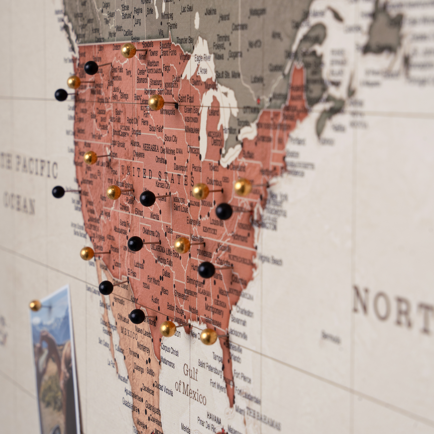 Unsere handgefertigte Karte mit Stecknadeln besteht aus hochwertigem Baumwollgewebe, einem Holzrahmen und einer Pinnwand.