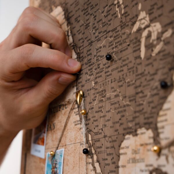 Exklusive Weltkarte als Pinnwand in Braun im Retro-Stil. Welche Personalisierunsgmöglichkeiten gibt es?