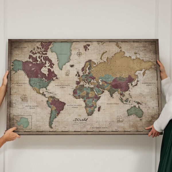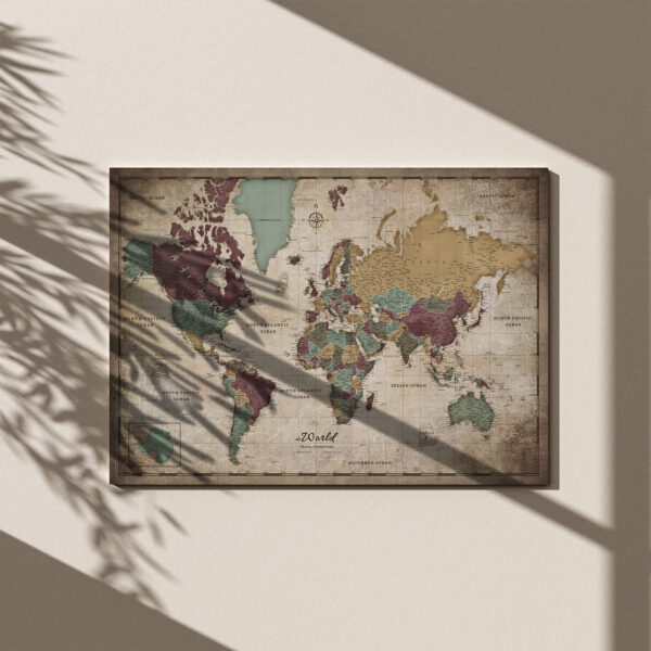 Die Karte ist fertig zum Aufhängen und benötigt keinen zusätzlichen Rahmen. Die Leinwand ist fest über den Rahmen mit der Rückseite gespannt, sodass die Stecknadeln perfekt in der Karte stecken und Sie bestimmte Orte markieren können.